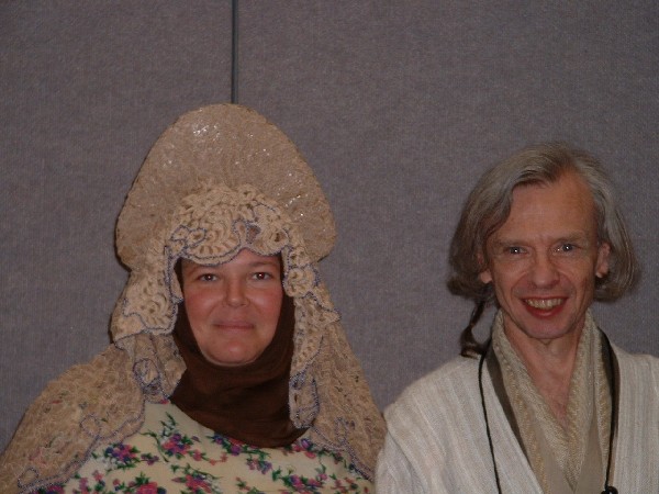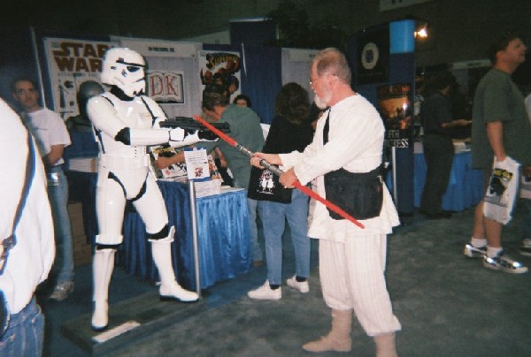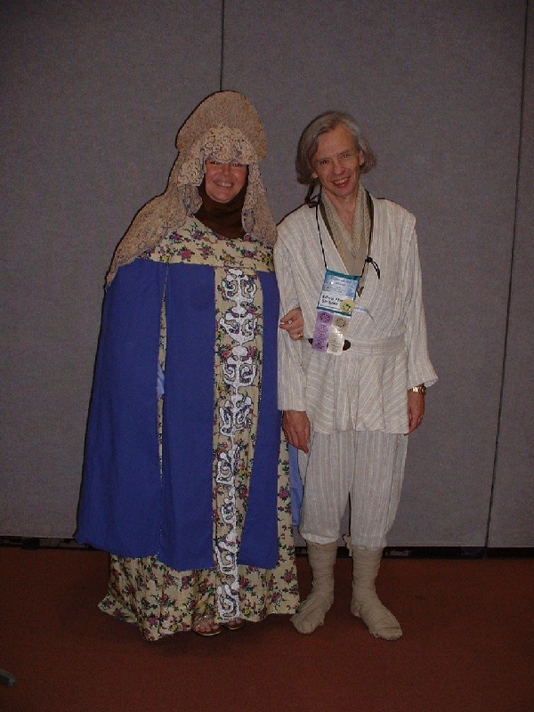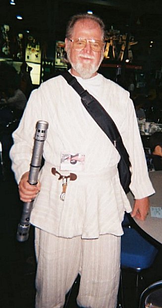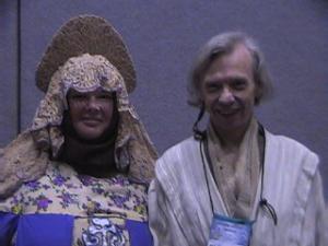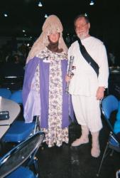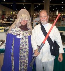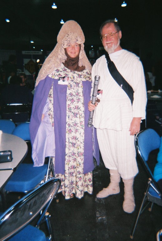 2002: ComicCon: Carol Phillips' nimble fingers have been at it again, this time creating Star Wars costumes. During Comic Con 2002, Carol dressed as Senator Padme Amidala and also dressed Larry up as Anakin Skywalker, complete with lightsabre.