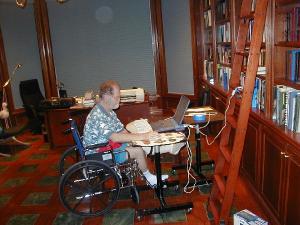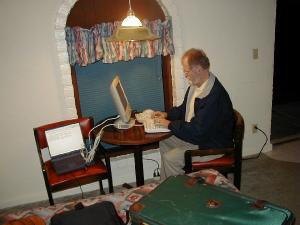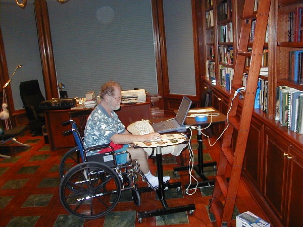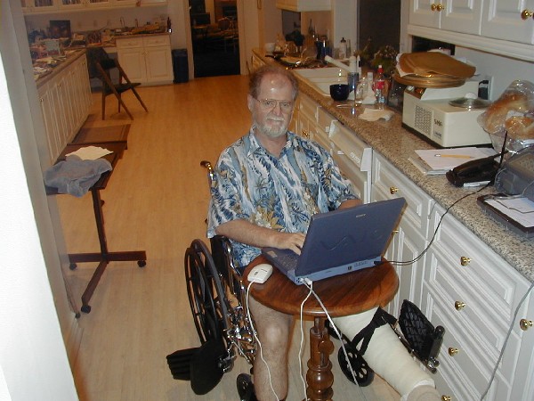 2001: This picture was taken on 1/5/01 in Larry's Kitchen at his home. As you can see, this is just after Larry's accident so he is struggling to work on his laptop balanced on his bad leg. Jerry took pity on Larry and sorted him out a proper connection