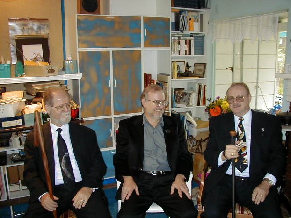 2001: This picture of Larry, Greg Bear and Jerry Pournelle was taken on 5/8/01 at Poul Anderson's Funeral. Greg Bear in the middle of the picture is Poul's son in Law, the picture was taken in Poul's office. Used with Permission from Jerry Pournelle.