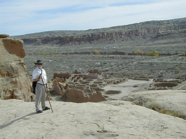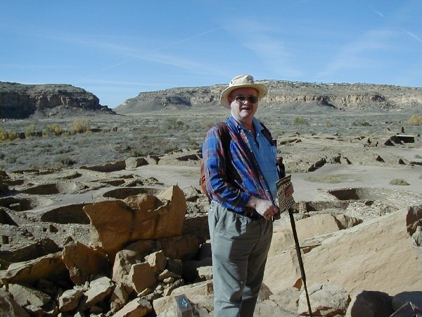 2001: Jerry Pournelle with the Pueblo Bonito behind him. Taken by Larry Niven on 17th October 2001. Used with Permission.