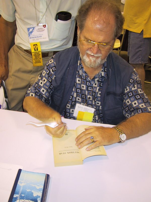 2001: Larry autographing a paperback edition of Neutron Star for Steven R. Station on 1/9/01 at PhilCon. Larry obviously get's his pens from Dune's (Frank Herbert Novel) Fremen. It looks like a Sandworm's tooth! Picture courtesy of Deltos Fleet Computing.