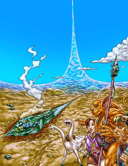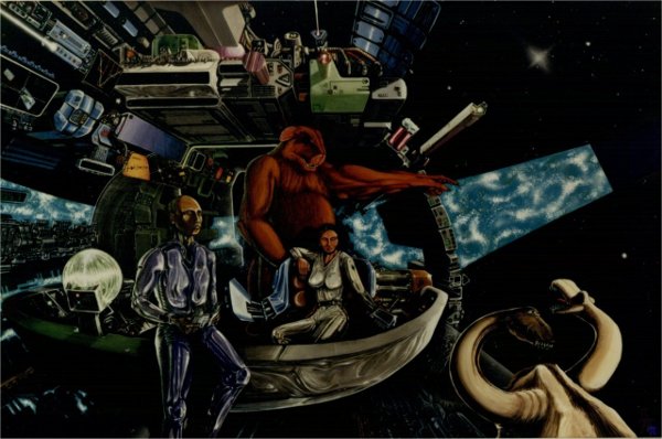 Ships: This image by Tom Gordon depicts the scene where the crew leave the wreckage of the Lying Bastard and venture out onto the Ringworld for the first time. On the right are Nessus, Teela Brown, Speaker-to-Animals and Louis Wu.