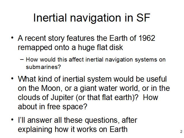 There is an obvious SF connection here - a fairly recent SF novelette was part of the inspiration of this talk - could inertial navigation systems designed on Earth work on a flat earth? How would you design an inertial navigation system that could work there, or on the Moon, or these other environments? I'll get to all that, after some detailed discussion of how it works on Earth.