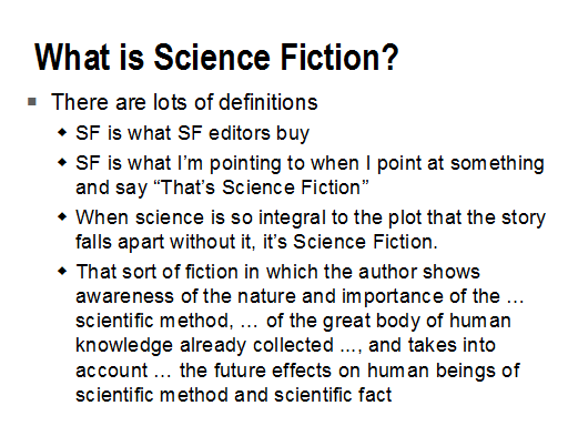 There is no commonly accepted definition of Science Fiction - all of the above have been proposed. I'm going to stick with the third and fourth, but the other two aren't as silly as they seem. These are taken from a book called "Turning Points: Essays on the Art of Science Fiction" edited by Damon Knight (1977). Number 1 is attributed to Norman Spinrad, number 2 is an obvious generalization of number 1 (and I'm sure I've seen it used somewhere), number 3 is attributed to Theodore Sturgeon, and number 4 is Reginald Bretnor's definition, paraphrased by Robert Heinlein. "Extrapolation" and "future" are two words also strongly associated with SF.