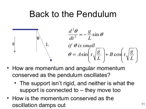 Back to the pendulum. Just because it's simple; as we look close, it might not be as simple as it seemed at first. It's not just the pendulum bob that moves - the support is moving too, and the object that the support is connected to is probably moving also - and the momentum of the support is in the opposite direction of the momentum of the bob, so the total system has zero momentum throughout the cycle of the pendulum's motion.