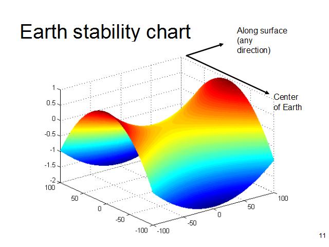 This figure shows the shape of the gravity gradient field near Earth, and thus the stability of a navigation system on the Earth - in the horizontal plane we have oscillating errors, and vertically, there are growing errors; but this is not necessarily true for all objects you might want to navigate on.