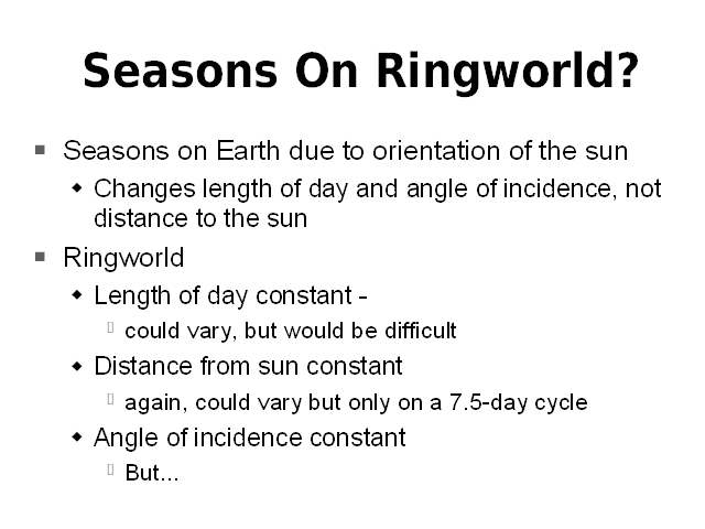 At first it seems as if Ringworld wouldn’t have seasons. After all, on Ringworld, the length of day is constant. While this could be changed by adjusting the distance between the shadow squares (note that the shadow squares aren’t in orbit around the sun either - they’re connected by improbably strong wires and are spinning faster than necessary to stay in orbit), it’s hard to imagine getting a useful amount of day length change over a long period and the mechanism to do so would be pretty complicated. Changing the distance to the sun is also possible (but see what happens two slides further), but since the Ringworld rotates with a period of 8 days or so, seasons would be very short. And it would seem that the angle of incidence of the Sun’s light would have to be constant – but that turns out not to be the case.