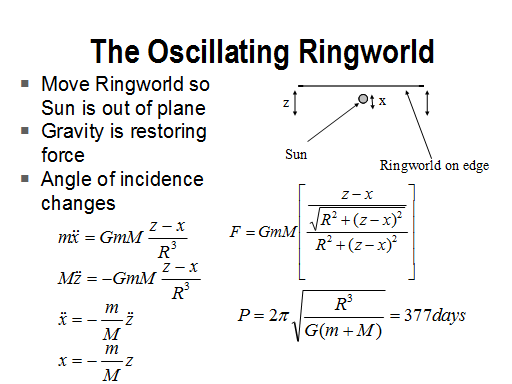 Here's a concept called the Oscillating Ringworld. If we move the Ringworld so that the Sun is no longer in the plane of the Ringworld, gravity will act as a restoring force. With no friction, oscillation occurs and goes on indefinitely, changing the angle of incidence of light on the Ring - Seasons! The equations go as follows. There is a gravitational force on the Ring and an equal and opposite force on the sun. The Ring mass is about 1/1000th of the Sun, so the Sun's oscillation is a thousand times smaller than the oscillation of the Ring. The period turns out to be about 377 days, giving a reasonable length to the seasons. This analysis relies on a small angle approximation, but would be reasonably accurate for angles up to 10 or so degrees, which would give significant seasonal effects (insolation would vary by 1.5% due to the angle, and 3% due to the increase in distance from the sun, adding up to a variation of about 5%, which is significant enough - compare with the change in insolation over a year due to earth's orientation - another exercise for the student!). Note that there are two winters and two summers in each cycle - an "up winter," a "down winter," an "up-going summer" and a "down going summer". Also note that the period of 377 days is just the same as the period for a planet moving in the Ringworld's orbit. There are only so many ways to combine the gravitational constant, the mass of the sun and the mass of an object to get an answer in units of time, so it's not surprising that the same answer turns up in a few different places. By the way, the mass of the Ringworld is actually significant even compared to the huge mass of the sun, so for the calculation of the oscillation's period I need to include both masses, instead of neglecting the smaller mass, which can be done in most planetary orbit calculations.