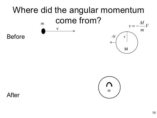 I'm going to belabour the next point a little bit, just because I've seen this question asked before - you start with two objects moving towards each other, and end up with one object spinning, so where did the angular momentum come from?