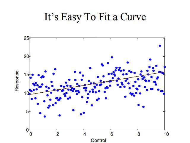 NOTES Here I fit the data with a simple line. It looks like it fits pretty well. Notice that what we've done is implicitly assume that the variation around the curve is that useless data called "noise".