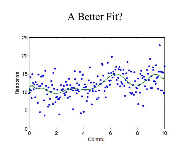 Here I fit the data with a 15th-order polynomial. Those of you who fit data to models regularly already know what's wrong with this, but for now just notice that the amount of noise is somewhat smaller - our theory explains more of the data, but uses more parameters to describe the fit.
