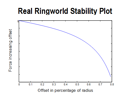 Here's the real Ringworld potential function, calculated by integrating the total force on the Ring - note the rapid drop off. That's why even with attitude jets, the Ring is probably only metastable - a big perturbation might overwhelm the jets' ability to restore the Ringworld to its proper place.