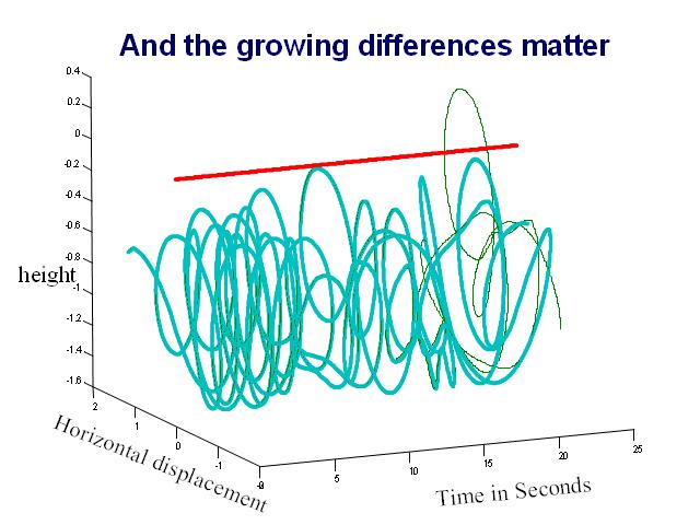 This is another view of the same phenomenon. After 20 seconds or so, the slightest change in initial condition is causing obviously very different results (position of only one pendulum bob shown) - in one case, the lower bob flips completely over the support, while in the other it does not.