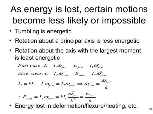 Since we're talking about rotation, let's look at Euler's equations for rotation. These are in what is called the "body frame" meaning that the rotations, torques, and moments of inertia are all fixed to the rigid motion that is rotating. I1, I2 and I3 are the moments of inertia around the body's three principal axes. If there are no torques, then it's pretty clear that steady rotation is only possible around one of the principal axes; otherwise you'll have "tumbling" or "precession" in which the axis around which the body is rotating is constantly changing (though angular momentum is still conserved)