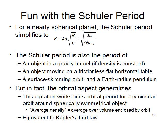Kepler's third law is that the orbital period of a planet is directly proportional to the 3/2th power of the semi-major axis of its orbit - and this equation for the Schuler period in terms of average density turns out to be that law in disguise for circular orbits (average density decreases with the cube of radius, but the equation here has a square root; putting those factors together produces the 3/2-power relationship between radius and period). This is a way to get a rough measure of G, the gravitational constant, or to measure average density of a newly discovered planet (just orbit an small object around it and measure the period).