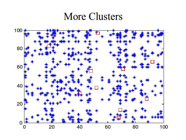 To demonstrate that point, here's another set of clusters; again, there is a correlation between some items and clusters of disease. But I cheated - this is the same data as before - this time the stars represent areas where the occurrence of the disease is substantially less than the average - since the pattern of connection to the squares looks essentially the same, that's evidence that there is really no connection.