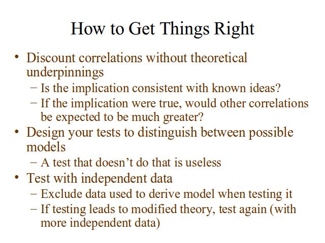 For example, I discussed the difference between finding in the data the fact that Israeli fighter-pilots tend to father many more daughters than sons (and I have read of a study that shows that), and having a theory that predicts a correlation between occupations that expose men to high acceleration and going to the data to find out if the predicted correlation exists. In the first case, you have something that may be a coincidence, born of the fact that if you look at a hundred possible correlations, 5 of them will show significance at the 5% level, simply by chance, while in the second case, you have an idea that can be tested by looking at fighter pilot data, astronaut data, and the like.