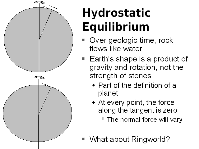 The overall shape of the Earth depends on the interplay between gravity and centrifugal force – the top figure shows a rotating spherical Earth. If you calculate the force along the tangent line at any point, you’ll find a net force towards the equator – so a loose object placed there will move towards the equator. In the long term, every object on Earth is loose – stone is just not strong enough to resist the continual force reshaping it. In the steady state the shape of the earth distorts just enough to eliminate the force along the tangent to the surface at every point; the normal force will vary from point to point, with a maximum at the pole and a minimum at the equator, but because the tangential force is everywhere zero, there is no further tendency for the shape of the planet to change.