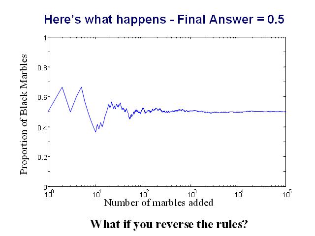 It's easy to see that the final percentage will be very close to 50%; here's the result of a simulation of the process - note that the percentage of black marbles jumps around a lot in the early stages, before settling down to 50%. Now imagine reversing the rules - if you pull out a black marble, replace the black marble and add another black one; if you pull out a white marble, replace it and add another white one.