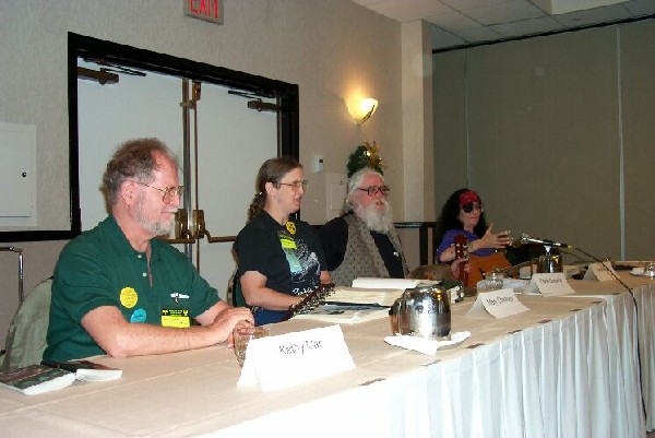 1999: Taken at Los Con 1999: Larry Niven, Mary Creasy, Frank Gasperik, and Leslie Fish, make up The Filk Panel. Courtesy of Frank Gasperik