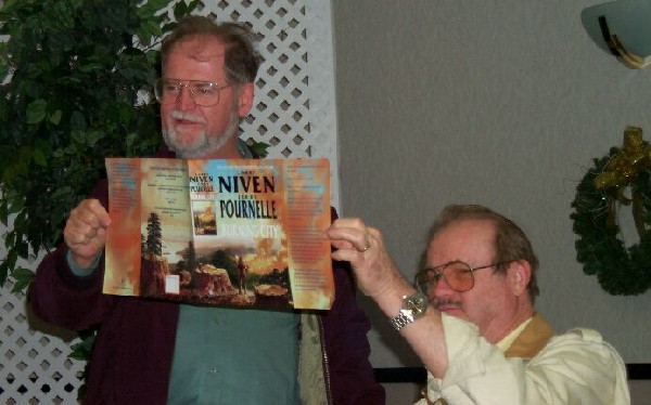 1999: Larry Niven and Jerry Pournelle holding up the dust cover for the Burning City during a promotional tour. Courtesy of Frank Gasperik