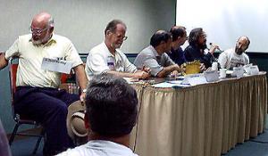 1997: Long Range Planning for Development of Mars and the Moon Panel members from the 55th World Science Fiction Convention Lonestar Con2 in Texas '97. To Larry's left is Dr. Robert Zubrin. Picture courtesy of Deltos Fleet Computing.