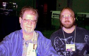 1997: Larry and a fan. Taken at the 55th World Science Fiction Convention in Texas'97. Picture courtesy of Deltos Fleet Computing.