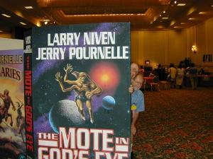 1997: Larry and Jerry peeping out from behind a huge Mote in God's Eye cutout during a promotional tour for the novel.