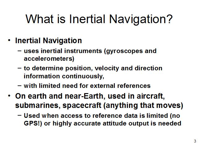 An inertial navigation system is built around inertial instruments - gyroscopes and accelerometers, both of which measure deviations from freely-falling motion: Accelerometers measure the deviation from free-fall and gyroscopes measure the deviation from non-rotation.