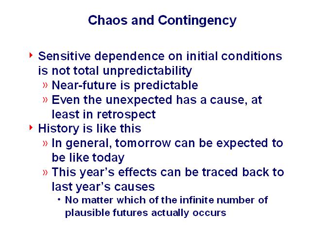 It's important to note that sensitive dependence on initial conditions does not mean total unpredictability. The near-future is predictable, and it's always possible in retrospect to explain why something happened, in terms of past events.