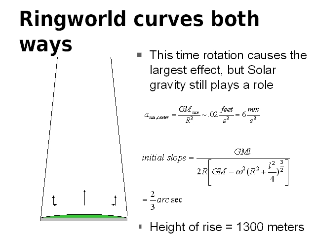 P.S. Note that I didn’t calculate the effect of the gravity of the Ringworld floor material, or of the soil, rock, water, etc. on the Ring. It’s easy to see that the effect of each of these would be to increase the size of the hump, though.