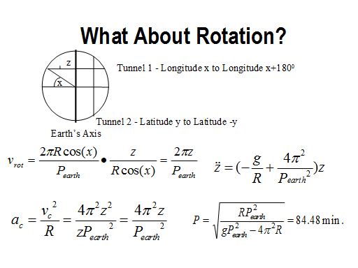 Now some of you are probably wondering about the effect of the Earth's rotation on this method of travel. There is one, but it's not as bad as it might seem. Tunnel 1 runs parallel to the earth's rotational axis, so the any acceleration due to the rotation is always perpendicular to the motion of Killeen's body, and so has no effect on that motion (as long as we assume the tunnel is completely frictionless). Tunnel 2 goes through the earth's rotational axis, so the acceleration due to the earth's rotation is always outward along the path of the tunnel. This requires some further analysis. The rotational velocity at the surface of the earth at latitude x is given by the distance of the surface from the axis and the period of the earth's rotation. The rotational velocity of a point in the tunnel is linearly related to that and to the distance of the object from the earth's axis. Combining these two factors we get a rotational velocity in terms of distance along the tunnel and the period of the earth's rotation. The acceleration due to this rotational velocity is given by this familiar equation, giving us the outward acceleration due to the earth's rotation (frictionless walls are really needed here, because the object would touch the walls throughout its trip). Combining this with the gravitational acceleration derived earlier, our differential equation is still simple and the solution is still harmonic motion, just with a different period. The new period of Killeen's oscillation through the earth is only 8 seconds longer than it was before. So, a trip that goes to an opposite latitude while staying at a given longitude is acceptable, a trip that goes to an opposite longitude at a given latitude is also acceptable, and in fact, any trip with a constant latitude (even if it did not go through the axis) would also be acceptable and have the same period as derived above. What's not acceptable? Well, any trip that changes latitude, but doesn't go to an opposite latitude would cause a rotational acceleration that was always in the same direction - Killeen would rocket out of the tunnel or perhaps get stuck part way through. I calculated one specific example - imagine a tunnel going from the North pole to the equator. It turns out that the final velocity of Killeen as he left the tunnel at the equator would be about 3 tenths of a mile per second - pretty fast. If the earth rotated as fast as Hal Clement's Mesklin (Mission of Gravity) the rate of egress would be a lot faster, but I wouldn't be justified in assuming a spherical Earth any more.