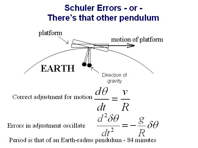 Now suppose that the alignment of the platform is incorrect by a small angle delta theta. The navigator's calculation of horizontal acceleration will be incorrect by -g*sin(delta theta), because its calculation of horizontal will be incorrect, leading to a miscalculation of horizontal velocity (even if the ship is not actually moving). Due to this error, the required adjustment to theta will be incorrect - leading to this equation for the change in the theta error. This equation describes an oscillator with a period of 84.4 minutes - the Schuler Period (not-coincidentally, the period of a satellite going around the Earth at ground-level).