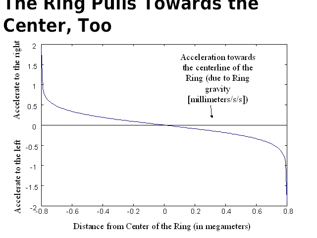 And here’s the force along the Ring (towards the centerline of the Ring), in blue (evaluated at the surface of the Ring). Note that the force towards the center due to the Ring gravity is about a third of the force due to solar tides – so it looks like the mass on the inside of the Ring is curved more than than I calculated before, but I haven’t done the math on this yet. To be really complete, I should take into account the non-linear effect – as the material on the Ring gets clumped in the middle, there’s a tendency to get more clumped, but that’s for another day, too.