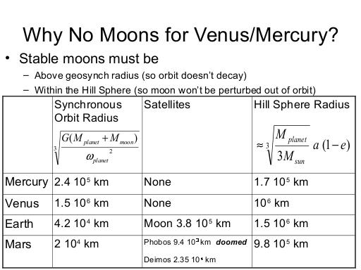 With that as background it's easy to figure out why it's not a coincidence that Mercury and Venus have no moons. As we've previously discussed, moons below the geosynch radius will have orbits that tend to decay, leading to an eventual collision with the planet. It's also true that each planet has a volume around which it will not lose a moon to the Sun - this is called the Hill Sphere (http://en.wikipedia.org/wiki/Hill_sphere), and depends on the planet's mass, the mass of the Sun, the distance from the planet to the Sun, and the eccentricity of the planet's orbit. So to have a long-lasting moon, which is neither perturbed out of orbit nor decays in orbit until crashing into the planet or being disrupted into a ring, the moon must be within the Hill Sphere (preferably well within it) and outside the geosynch radius - and for Mercury and Venus there is no such place; the Hill sphere is inside the geosynch radius.