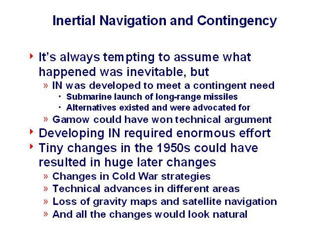 It's easy to imagine tiny changes in the 1950s that would result in inertial navigation not being developed, or being developed in a different way, resulting in huge changes, as the balance of the cold war changes, intellectual energies that would have been devoted to developing IN go elsewhere, and spinoffs go away, replaced by other spin-offs from whatever other technologies take the place of IN. And to the people who experienced that history, everything would seem as natural as our history appears to us.