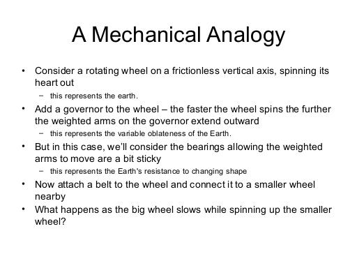 The big wheel slows as it spins up the smaller wheel (and the whole system slows in general due to friction, even when the two wheels reach equilibrium), but the governor's arms are sticky so even after the big wheel has slowed a bit, the arms are still extended a bit too much. If you give the wheel a tap (earthquake!), that will dislodge the governor's arms, allowing them to fall a bit (reducing the oblateness) and temporarily increasing the big wheel's speed. It's technically possible for a tap on the wheel to cause the governor's arms to rise a bit, taking the governor further from equilibrium but that's not very likely; similarly, it's possible for an earthquake to increase the Earth's oblateness but that's not the way to bet.