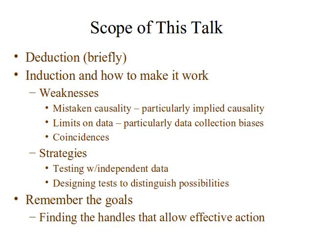 I'm going to start with a quick mention of deduction, just for completeness, then move onto induction for the main body of the talk - first about some of the ways induction can be misused - mistaken causality, data collection biases, and coincidence, and a few of the ways to overcome these weaknesses - using independent data to test your conclusions , and designing tests to distinguish between hypotheses with some theoretical basis.