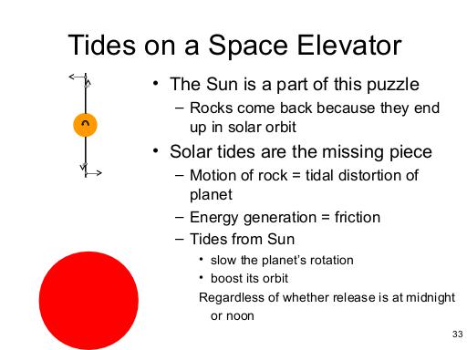 So where does the angular momentum go? The angular momentum lost to the Earth as the rock moves outward and when the rock is released remains with the rock and is returned to the Earth after an orbit or two - but the angular momentum that is transferred from the Earth's rotation to the Earth's orbit by tidal forces on the Earth-elevator-rock system doesn't go with the rock, and so isn't returned when the rock impacts again. This transfer of angular momentum is associated with the energy generated during the rock's motion up the elevator, and you can't get the momentum back from orbital motion to rotational motion without adding that energy back.