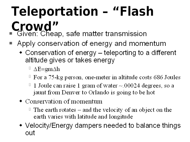 Here’s a thought experiment for students. What if teleportation were possible, but the laws of conservation of energy and momentum still applied. Niven played with this idea in his “Flash Crowd” stories – a change in altitude requires causes of gain or loss of potential energy, which translates into heat gain or loss. Transfer to a different latitude or longitude results in a problem because the object being teleported retains the velocity it has due to the Earth’s motion at the location it’s teleporting from – which could mean being slammed into the wall at dozens of miles per hour at the new location (see http://groups.msn.com/AndysUsingScienceFictionForEducationPage/studyguid... for some calculations).