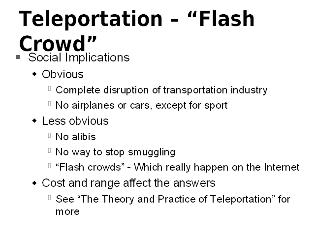 But the students could have some real fun figuring out the social implications of teleportation. Some are obvious (no airplanes or cars except for fun), some are less so, like the effect on crime, or the creation of “flash crowds” (a flash crowd is a crowd that appears whenever and wherever something interesting is happening. If we assume that teleportation is cheap and easy, a crowd can grow very quickly, since it draws on the whole world's population of possibly interested parties). We see “flash crowd”-like effects on the Internet now - “teleporting” to a web site is easy, so an overwhelming number of hits can happen to any site that is attractive (see the Risks forum for a mention of this http://catless.ncl.ac.uk/Risks/17.86.shtml#subj8). I highly recommend Niven’s article on the subject, by the way.