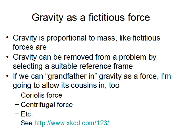 Gravity is proportional to mass - and gravity can be removed from a problem (locally) by a suitable reference frame selection. By that standard, gravity is a fictitious force, only included in the family of real forces by being "grandfathered in" so I feel no hesitation in allowing gravity's cousins like the centrifugal force and Coriolis force into the club. XKCD, the geeky webcomic (whose author, Randall Munroe, is up for a fan artist Hugo award this year) makes a similar point in issue #123.
