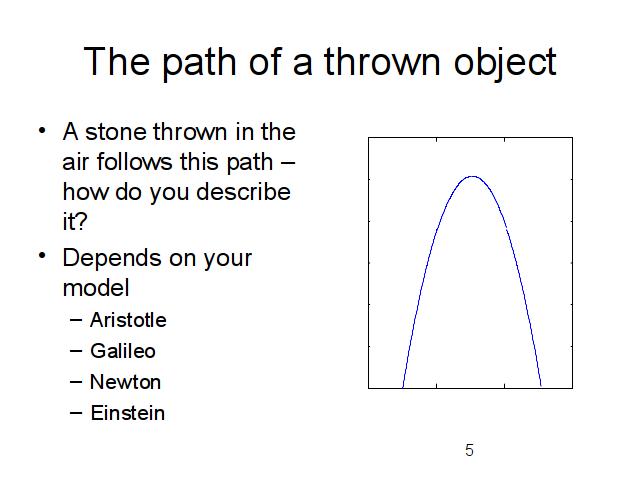 Consider the motion of a thrown object: Aristotle described this motion as a brief deviation from the normal state of things - a stone belongs on the ground and will naturally seek to return to that condition (not location), after the impetus provided by the initial throw is dissipated. Galileo could apply mathematics to the motion and recognize the shape as a parabola, with the initial velocity constantly decreased by the constant acceleration of gravity - but though he had no model for the underlying cause of gravity, this model had immediate spinoffs in ballistics. Newton would call the motion not a parabola, but the tip of an ellipse, with one focus at the center of the Earth, and modeled the varying acceleration as due to an “action at a distance” force inversely proportional to the distance between the stone and the center of the Earth - and this model provided all that is needed for launching probes to other planets. Einstein modeled the stone's motion as following the shortest path in curved space-time - and this kind of model allows us to predict the future of the universe - and to use GPS to find our way home.
