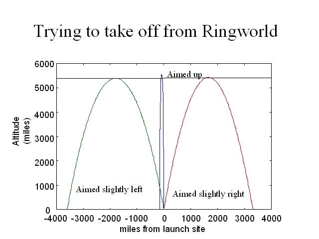 One way the approximation fails is a bias to the antispinward – if an object is launched straight up at 8 miles a second, it will land about 100 miles antispinward, and if the object is launched aimed slightly spinward, it will reach about 36 miles higher than if launched antispinward. This is also a demonstration of the difficulty in taking off from Ringworld. At 8 miles/second a rocket would leave earth easily, but on Ringworld at the same velocity a projectile crashes. We’ll explore the comparison between Earth and the Ring in more detail in the next few slides.