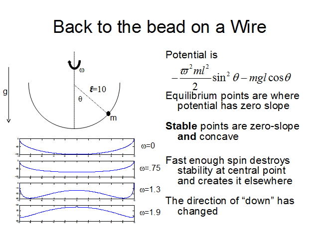 I've shown the potential well for the non-spinning case, which looks just like the original semi-circle (except for the way I've scaled things), and for three different values of spin rate. At low spin rates, the bottom of the potential well becomes shallower, but still is concave at the bottom, but at a critical spin rate, the equilibrium point at the center stops being a stable point, and two new equilibrium points appear - both are stable points. As the spin rate increases further, the new stable points move further and further away from the center. The direction of "down" has changed because the combination of gravity and centrifugal force; in fact, if you took a non-spinning wire shaped like the potential well, the bead would move on that wire the same way that the bead moves on the spinning semicircular wire.