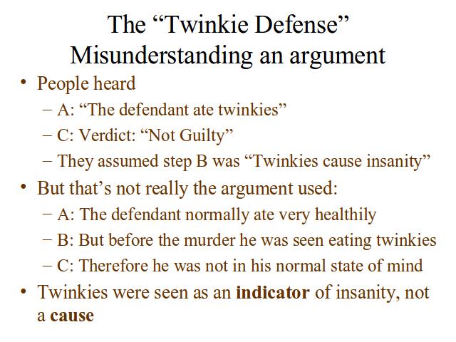 Note: I was pleased to see everyone in my audience immediately grasped the distinction between the version of the story presented by the audience member and the true story - a useful analogy for people who need a little help with the concept is when a man who is normally clean-shaved and dressed in a suit starts wearing rags and stubble, it is possible to conclude that he's not in his normal state of mind - but not that wearing rags made him crazy. I also added that one psychiatric expert did point out that getting a sugar rush might have exacerbated the defendant's mental state, which may have led to some of the confusion in the media.