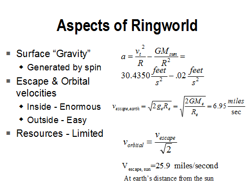 However, the cost of gaining standard gravity with rotation is that it's not easy to get off the Ring. Orbital velocity near earth's surface is only about 5 miles per second and escape velocity is only about 7 miles a second - velocities that can be achieved with chemical rockets. On Ringworld, however, any object lofted away from the surface must achieve a velocity of 740 miles/second in the right direction or the velocity it already has by being on the Ringworld will slam the object into the Ringworld's surface with great force. On the other hand, if there were an way to get to the outside of the Ring, simply letting go would give you enough velocity to escape the star's gravity entirely. For that matter, of course, even landing on the Ringworld would be tricky, since matching the surface's velocity would be required and that velocity is far above the natural velocity of an object orbiting the Ringworld's sun at the Ringworld's radius. In the novel, the heroes crash-land, but this is not recommended for anyone without an impervious stasis field. Catty Nebulart pointed out via email that escape from Ringworld (or landing on the outside of the Ring) can be thought about by considering escape from the Ring as transfer from an orbit that momentarily has a radial velocity of zero and a tangential velocity of 740 miles/second to a circular orbit that needs to have a tangential velocity of 18 miles per second (or the reverse process for landing on the outside of the Ring); the need to add or subtract a huge amount of velocity very quickly is obviously a huge challenge for conventional rockets.