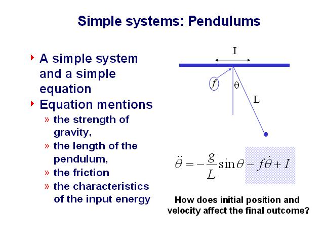 To explore this issue further, let's look at this simple system - a pendulum. This is a diagram is a little more realistic than the ones usually used in textbooks. In addition to gravity that pulling the bob back to the center, there is friction resisting the movement of the bob, and a driving force adding energy to the system. And I haven't assumed that the angle is so small that the sin of theta equals theta. Note that in addition to the length of the pendulum, the strength of gravity, the amount of friction and the characteristics of the input signal.