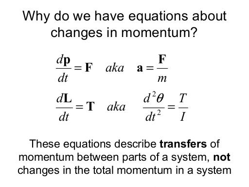So when you see the equations that are commonly used to describe how linear or angular momentum changes with force or torque, remember that they are really describing how momentum is transferred from one part of a larger system to another; it may be useful to consider only one part of a system, but there are situations for which dealing with the whole system (and therefore with transfers of momentum, not changes) is vital.