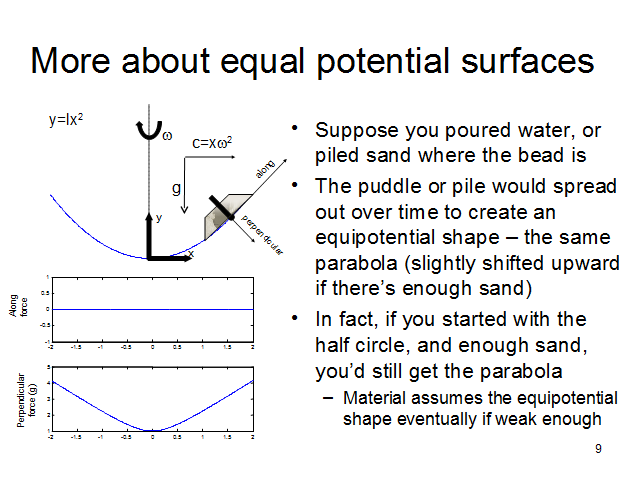 Suppose you made the spinning parabolic wire into a spinning parabolic bowl, and placed a pile of sand at one point on the bowl. The pile of sand would spread out due to the perpendicular force, to create a new equipotential surface, also parabolic. In fact, if you put sand or water in a spinning hemisphere, or a spinning cone you’d get a parabolic shape when the sand or water reached equilibrium - the equipotential shape is the nature shape for anything not strong enough to hold its own shape.
